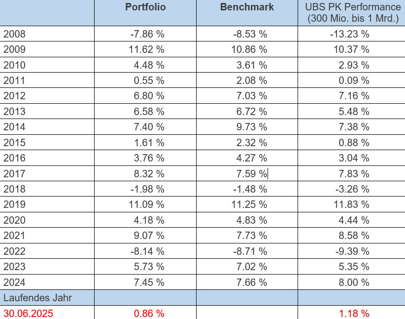 Vergleich: Portfolio-Rendite mit Benchmark und mit UBS PK-Performance Peer-Group